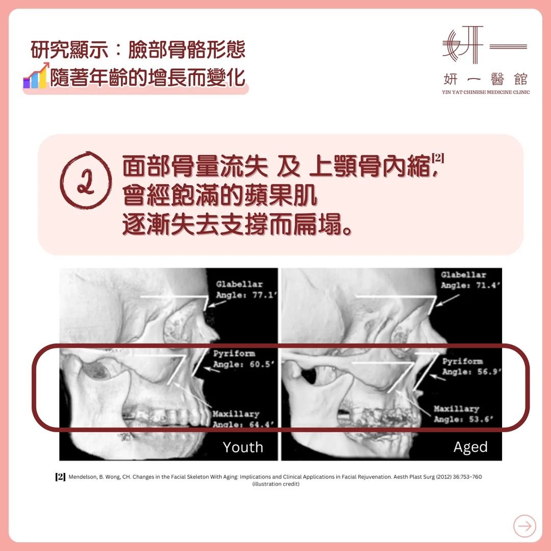 - 面部骨量流失:特別是上顎骨內縮,導致蘋果肌失去支撐。