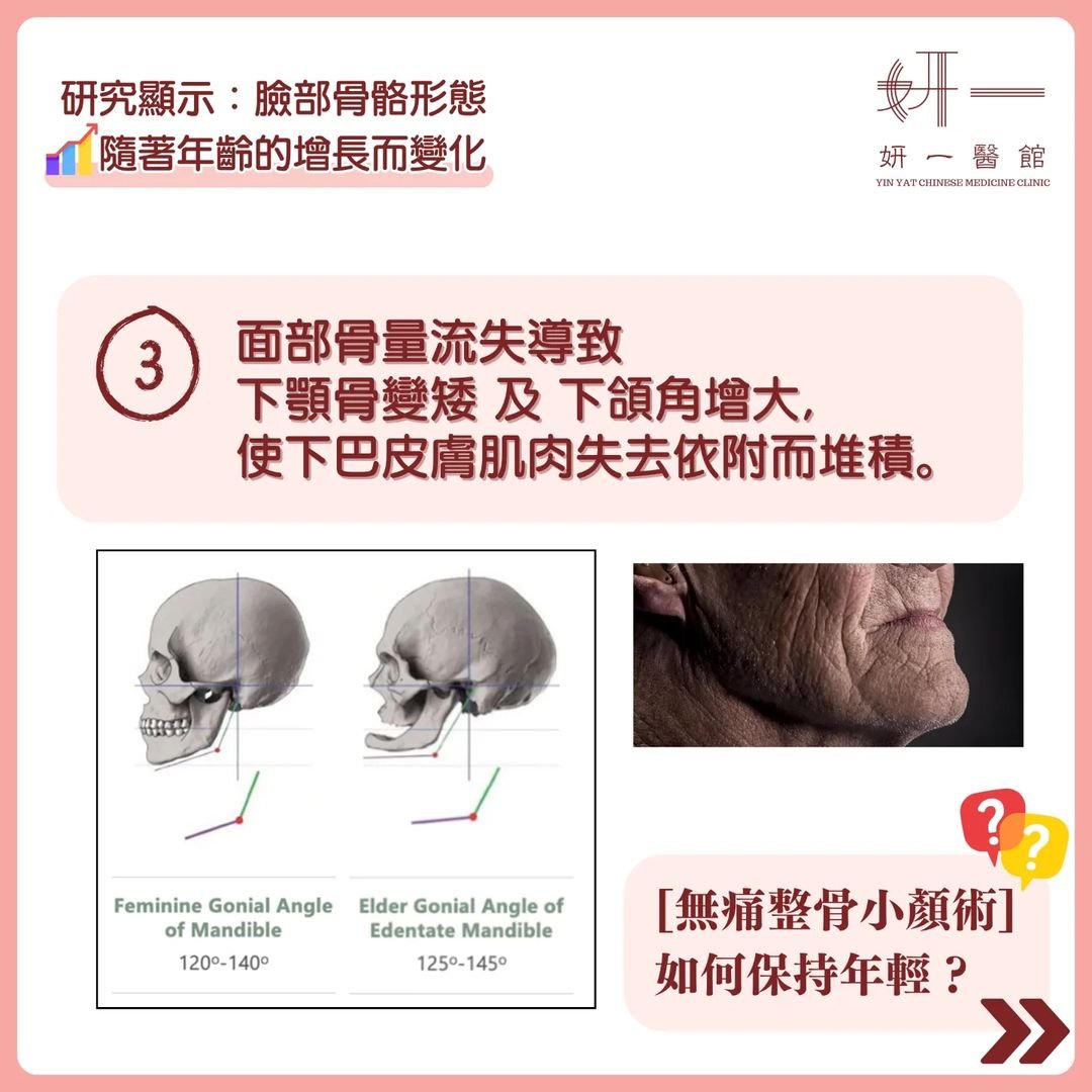 - 下顎骨變化:變矮且下頜角增大,造成下巴皮膚鬆弛。